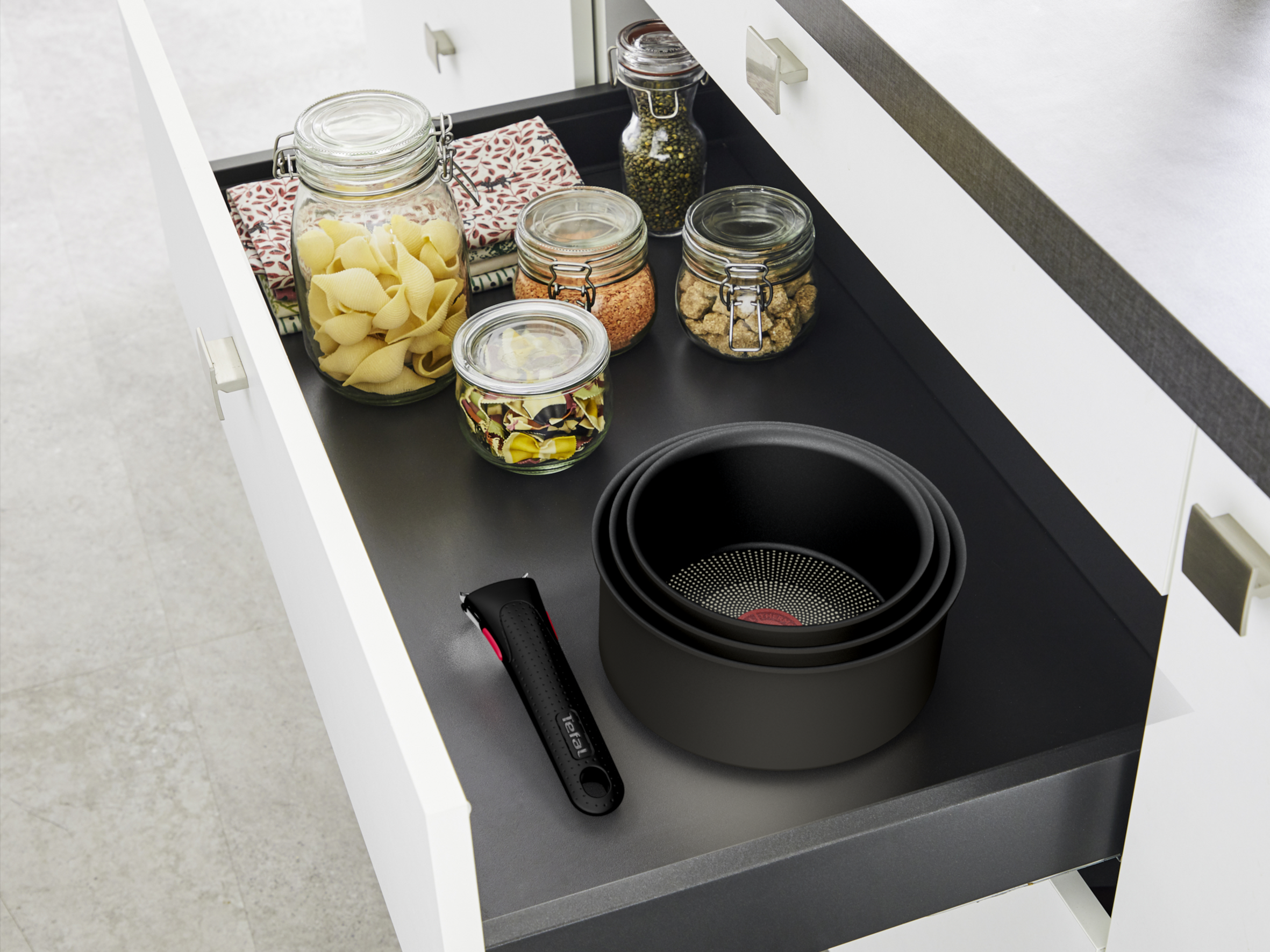 Тенджерите и тигани с подвижни дръжки Tefal Ingenio улесняват ежедневното готвене! Дизайнът на съдовете за готвене Ingenio, който позволява подреждането им един в друг. Това спестява място и вашите кухненски шкафове винаги изглеждат чисти и подредени. Планирането на храненето също се улеснява, защото можете да използвате един съд за готвене, претопляне и съхраняване на остатъците от приготвените ястия в хладилника.