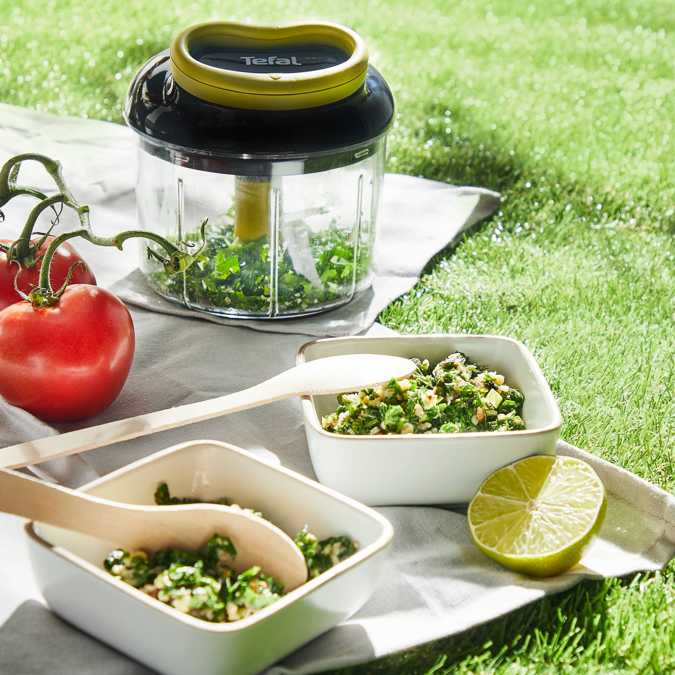 Насладете се на бързи и лесни рецепти за вкусни ястия вкъщи, благодарение на 5-секундния чопър от Tefal! Независимо дали режете лук, без капчица сълза, смилате ядки с лекота или приготвяте вкусни разядки като гуакамоле и хумус, интелигентната технология на уреда осигурява бързи резултати за всевъзможни рецепти, без усилия. Просто поставете остриетата, поставете съставките, затворете капака и издърпяйте дръжката... Колкото повече дърпате, толкова по-фино режете! С патентова турбо система, този ергономичен механичен чопър е оборудван с изключително устойчиви подвижни остриета, които могат да се справят с всяка храна. Приготвяте любимите си рецепти в пълно спокойствие, благодарение на безопасната заключваща система. Механичният чопър е изключително удобен, благодарение на напълно прозрачната купа можете да наблюдавате размера на рязане на храната, удобната ергономична дръжка и нехлъзгащата се основа. 5-секундият чопър премахва неудобството при приготвянето на храната и поставя вкусните идеи обратно на масата!