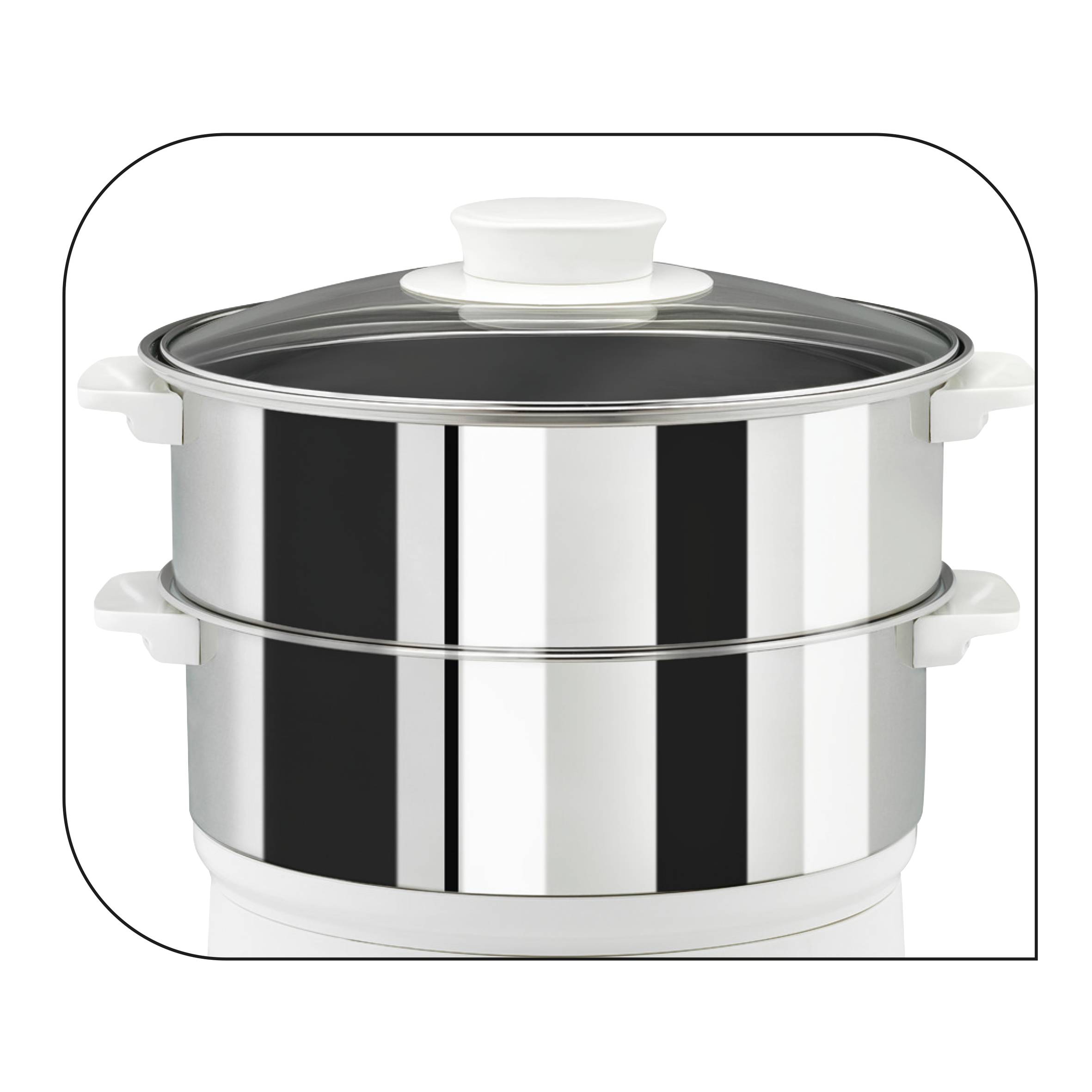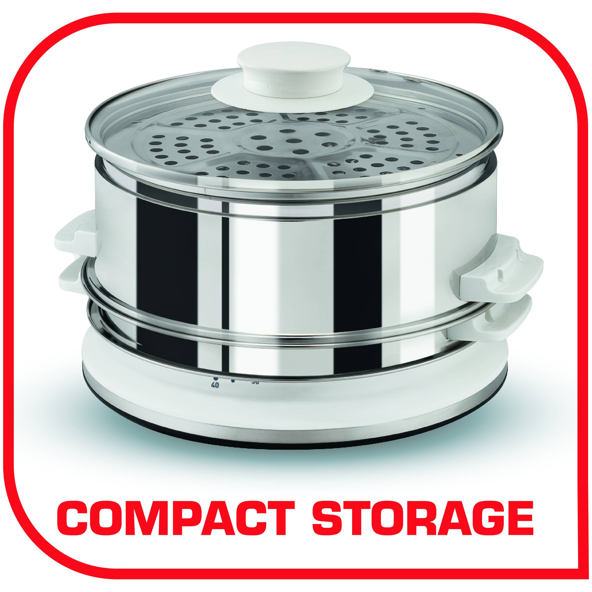 Kупите могат да се съхраняват обърнати обратно върху основата, което позволява компактното му съхранение. Таймерът с автоматично изключване ви осигурява лесна употреба. Нивото на водата е винаги видимо и лесно можете да доливате по време на готвене. 60 минутен механичен таймер със звуков сигнал ви съобщава кога храната е готова. Видим индикатор за нивото на водата 2 купи, които могат да се съхраняват една върху друга, с капацитет 6 литра.
