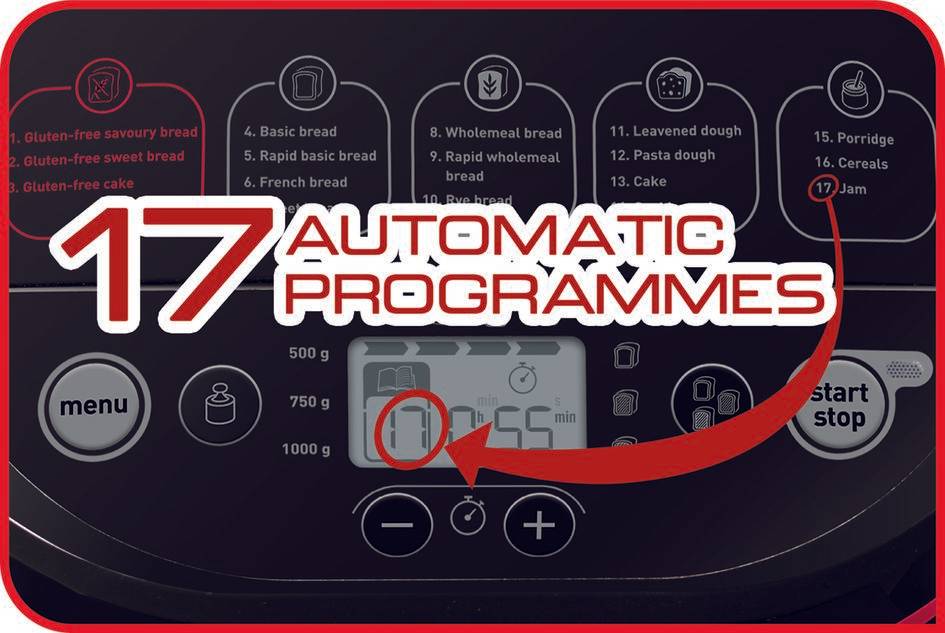 Предимства на Pain Plaisir, Хлебопекарна PF220838, 17 програми, 1кг, Черна