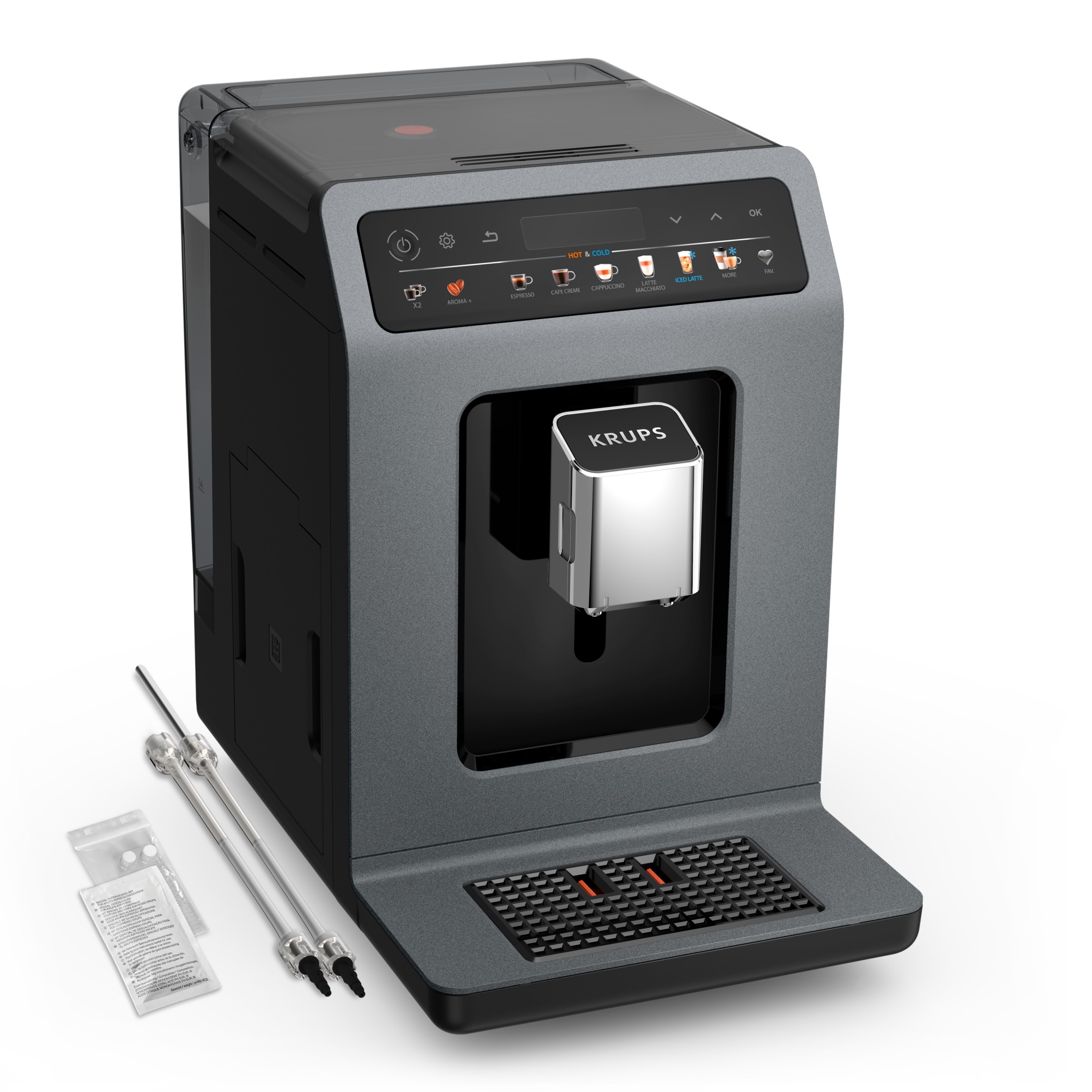 Представяме ви KRUPS Evidence Hot & Cold - автоматичната еспресо машина, която предлага изкушаващи топли и студени напитки , наситени с аромат и приготвени с финес. Открийте истинско бариста изживяване у дома с 18 рецепти за топли и студени напитки, елегантен и удобен за потребителя интерфейс и технологията Cold Brew Aroma, предлагаща перфектна екстракция за безупречни ледени напитки и др.