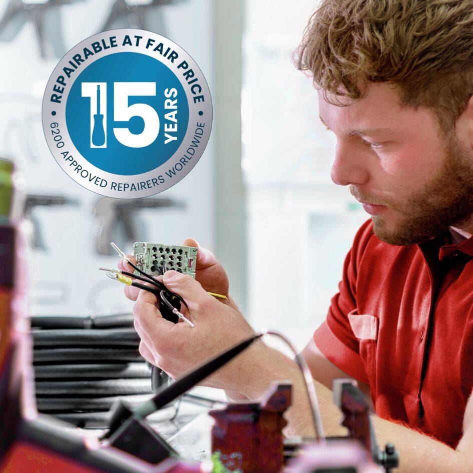 Предимствата на възможността за сервизна поддръжка и издръжливостта на продуктите са валидни за всички. Тъй като борбата с отпадъците е една от основните ни грижи, ние се ангажираме да съхраняваме резервни части в продължение на 15 години, за да осигурим ефективен ремонт на вашия продукт на справедлива цена. Нашата мрежа от 6200 одобрени места за ремонт ще ви помогне в целия свят в случай на повреда или малка дисфункция. Следете за специалното лого за сервизна поддръжка върху отговарящите на условията продукти и се насладете на лесни и бързи ремонти!