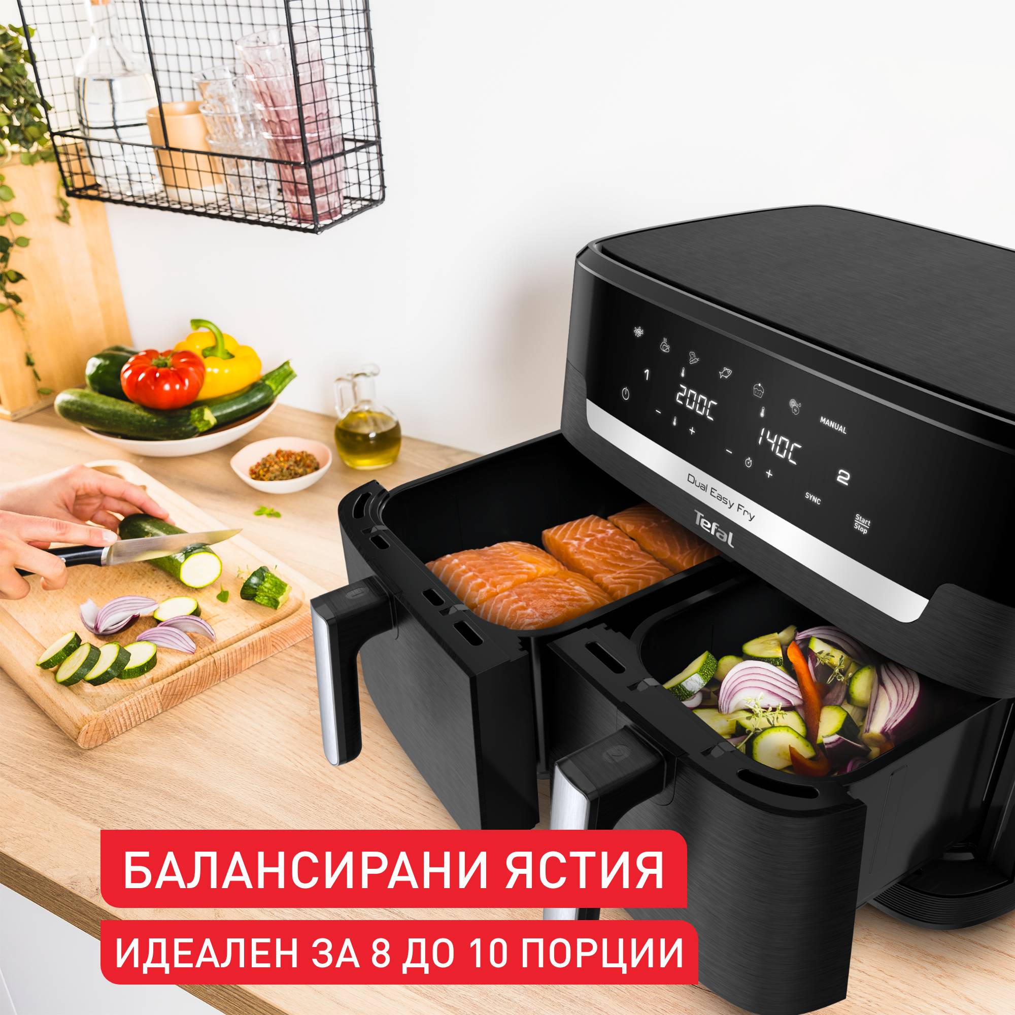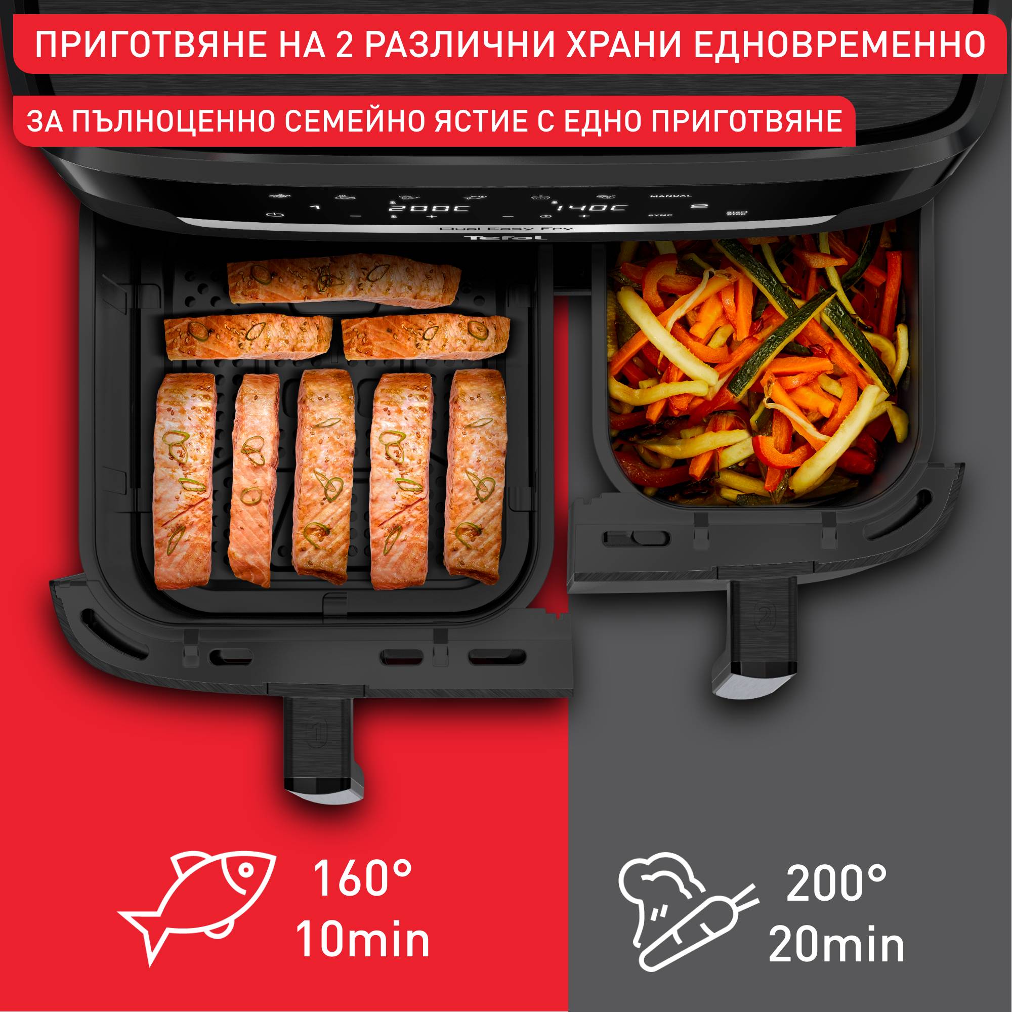 XXL Двоен уред за готвене с горещ въздух, който приготвя две различни съставки наведнъж, за пълноценно ястие, сготвено наведнъж Най-големият двоен уред с горещ въздух от Tefal: Вместимост XXL с чекмедже от 6.5 L и чекмедже от 4.5 L— идеален за 8 до 10 порции 7 автоматични програми: Пържени картофи, пиле, зеленчуци, риба, десерт, дехидратация и регулируем термостат (40-200°C)
